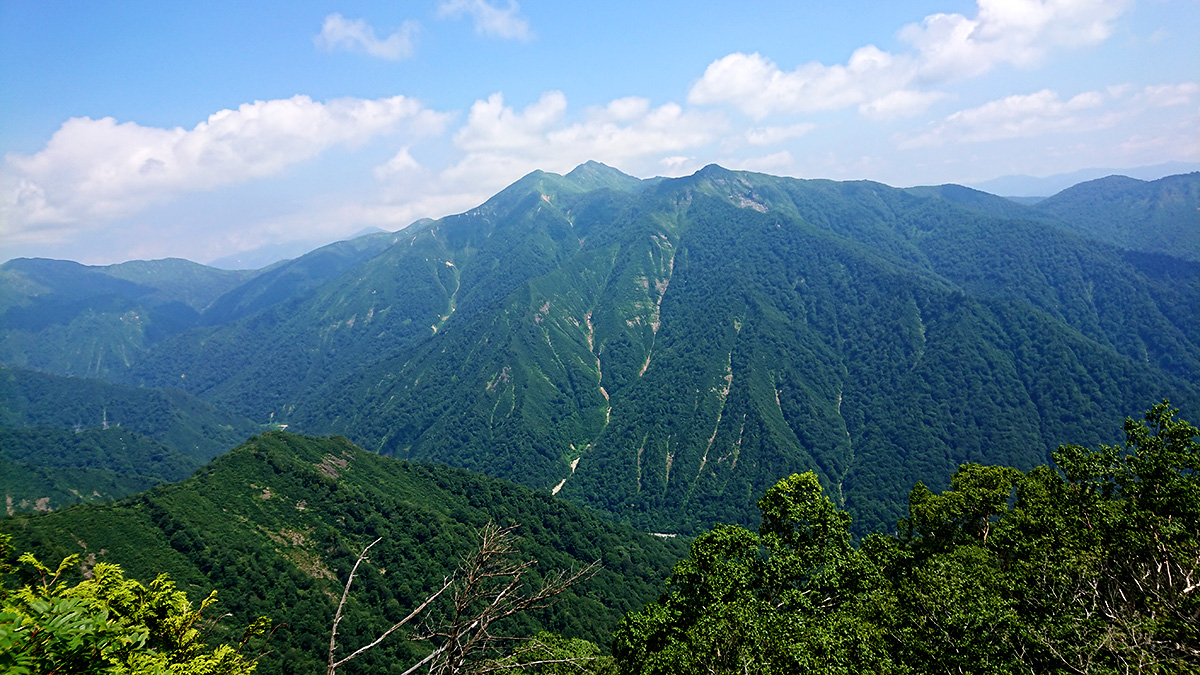 この山域の山の特徴の西側のなだらかな斜面と東側のストンと落ちた斜面が良く見える。