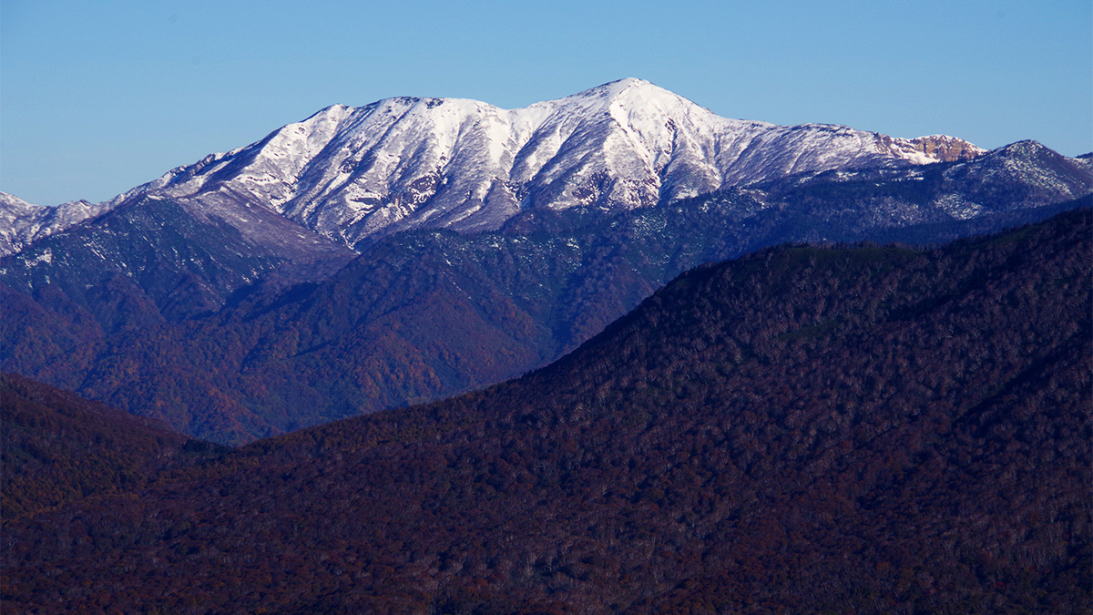灌木の向こうに紅葉の戸隠連山が顔を見せる。