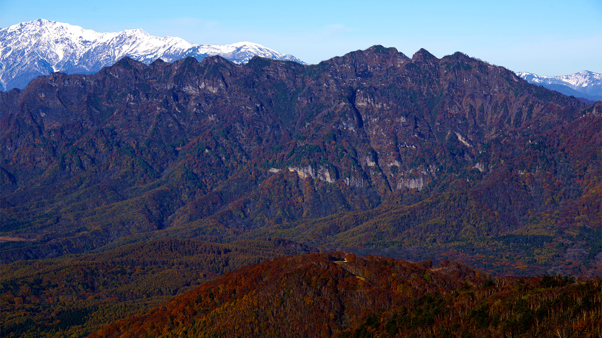 紅葉の荒倉山とその向こうには冠雪の北アルプスがそびえる。